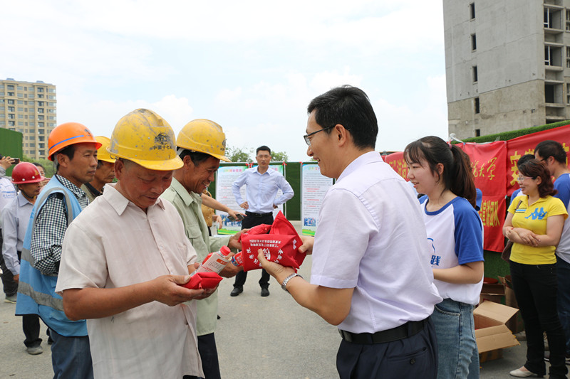张庆亮等一行向工友们发放暑期防暑降温包和饮料,热情提醒工人注意安全。