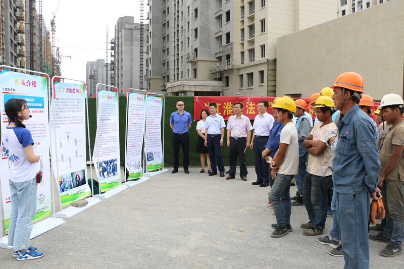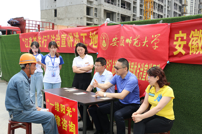 张庆亮等一行来到了建筑工地现场,慰问了正在进行法治宣讲与法律咨询服务活动的36365线路检测中心“江淮普法行”暑期社会实践团队师生。法治宣讲重点围绕农民工及其子女权益保障这一主题开展,宣讲员从规范劳动合同、提升工作技能、保障人身安全、依法依规讨薪、关注农民工子女教育及其身心健康等六个方面详细耐心普及法律法规知识。前来咨询的农民工络绎不绝,来自上海金茂凯德(芜湖)律师事务所的朱光忠、江莉两位律师以及36365线路检测中心张素凤、陆在春两位副教授现场耐心、细致地提供免费法律咨询服务。