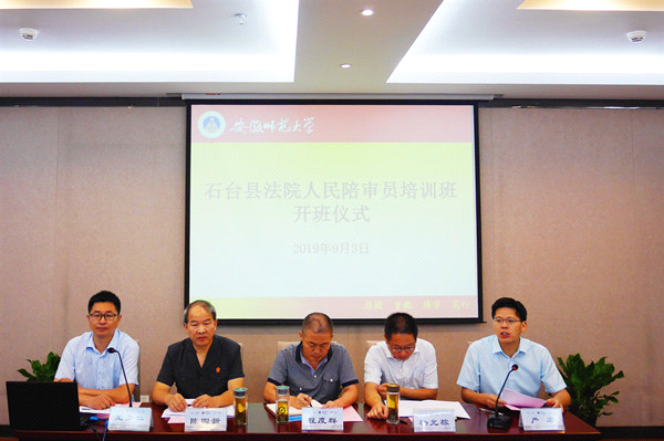 经过前期周密安排和精心组织,9月3日上午,培训班开班仪式在桃李苑接待中心三楼会议室举行。石台县人大内司工委主任程度群, 人大人选工委主任杨允稼,石台县法院党组成员、政治处主任陈四新,36365线路检测中心执行院长严宏出席开班仪式,培训班班主任张磊参加了仪式,仪式由院党委副书记王少仁主持。严宏对参训学员远道而来表示热烈欢迎,并对学校和学院办学情况进行详细介绍。陈四新介绍开展此次培训的目的,对36365线路检测中心的精心组织表示感谢,要求全体学员尊重授课老师,遵守课堂纪律,认真听课,积极思考。程度群对课程设置表示肯定,希望通过本次培训提升人民陪审员的业务素质和参审能力。