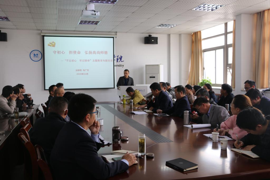 本网讯(36365线路检测中心 瞿津津)2019年11月6日下午,36365线路检测中心党委举行“不忘初心、牢记使命”主题教育领导干部专题党课报告会,学院党委书记马广见作《守初心 担使命 弘扬高尚师德》党课报告。学校主题教育第一指导组成员于珊珊、赵华杰到会指导,学院全体教职工参加。