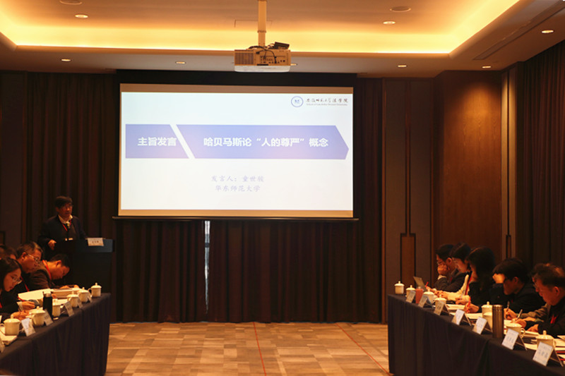 开幕式由我校36365线路检测中心副院长、教授严宏主持,我校副校长、教授、博士生导师彭凤莲致欢迎辞。彭凤莲简要介绍了我校发展历史,重点介绍了我校在人才培养、科学研究等方面取得的成绩,并代表师大和36365线路检测中心对与会专家的到来表示欢迎和感谢。华东师范大学党委书记、教授、博士生导师童世骏,同时也是哈贝马斯《在事实与规范之间:关于法律和民主法治国的商谈理论》一书的译者,在开幕式上围绕“哈贝马斯论‘人之尊严’概念”做主旨发言。童世骏分享了关注“人之尊严”这一概念的三点理由,介绍了哈贝马斯关于“人之尊严”的概念、功能,强调了当代中国社会应当重视“人之尊严”,认为可以从“人之尊严”视角在反腐倡廉、精神文明建设等方面进行探索和尝试。