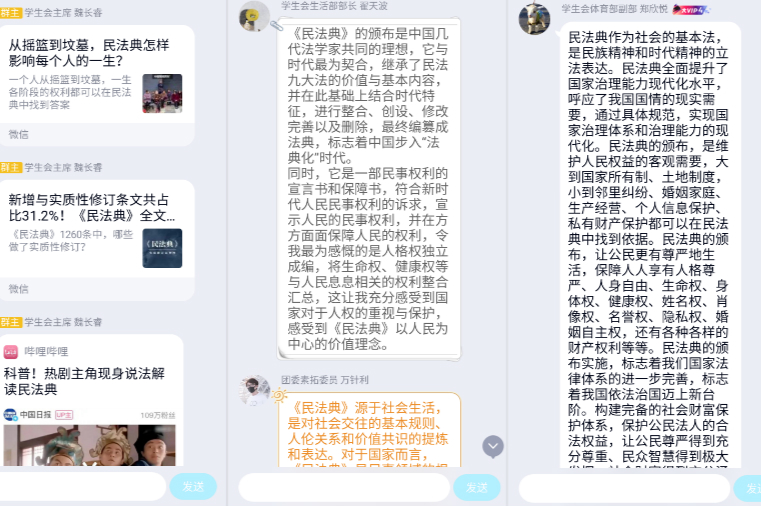学院三大社团也通过不同形式开展了线上学习交流,并分别从不同层面和角度深入研讨和发表看法,阐述了《民法典》颁布的重要性。青年法学社徐盈姿通过引用“国之重器,无法不通;法之根本,非律不行”的名言强调法律在治国理政中的重要作用,深刻感悟到:“《民法典》的制定不仅完善了我国的法律体系,更重要的是让我们每个人在社会生活领域得到最真切的保障。”