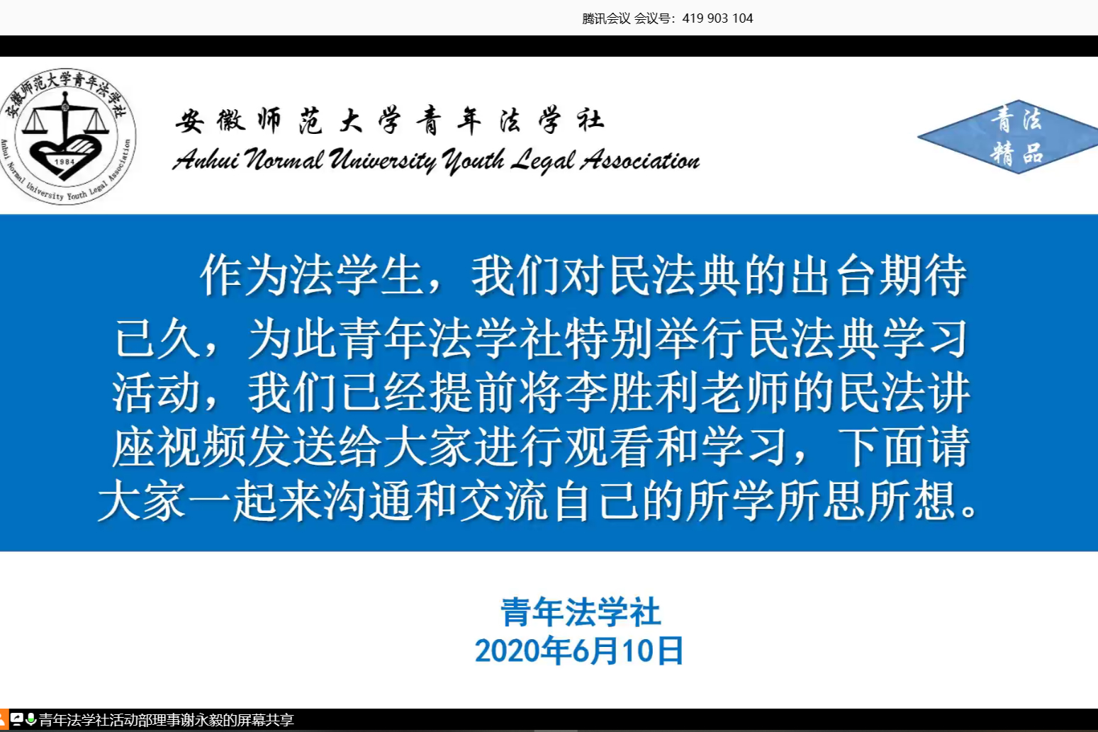 6月7日晚七点,由学院民法老师李胜利主讲的“《民法典》学习讲座”于腾讯会议平台线上举行。学院18、19级全体同学积极到场聆听。李胜利介绍了《民法典》颁布的具体时间和重要历史意义。他指出《民法典》的出台是党和国家全面推进依法治国和发展中国特色社会主义市场经济的应世之举。他从“现实需要”、“重大举措”、“客观要求”和“必然要求”的四个角度切入,深刻阐述《民法典》对于新时代中国特色社会主义建设的必要性和重要性。“《民法典》凸显了以人民为中心的思想理念,添加了“绿色、生态、环保”的独特色彩。”他用宏观变化、中观变化和微观变化来解释民法典体系结构与主要内容的改变,并借此机会提醒同学们要重视《民法典》所解决的问题,号召法苑学子更加细心严谨地学习研究《民法典》。