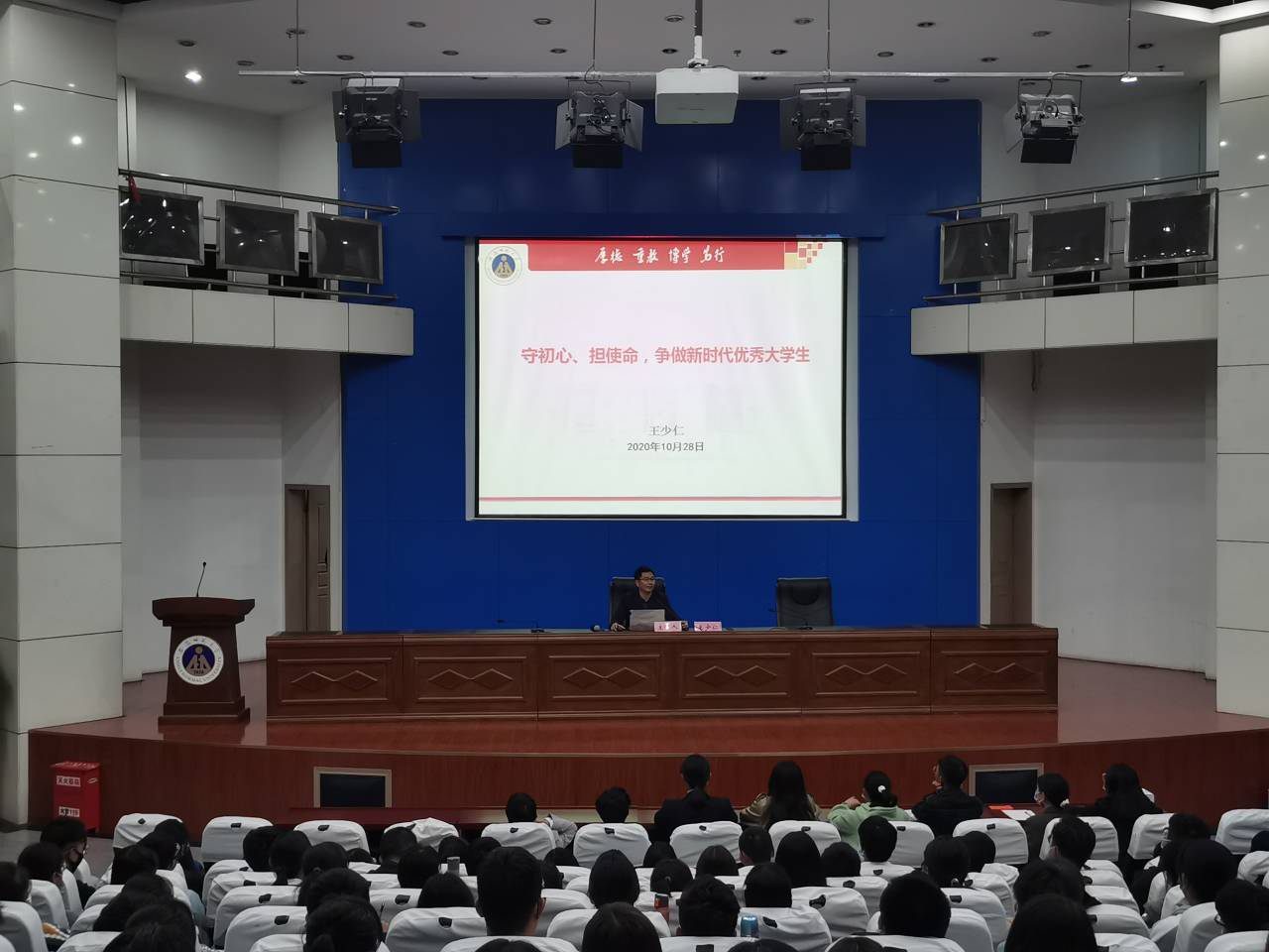 王少仁围绕“守初心、担使命,争做新时代优秀大学生”的主题开展,他结合自身的学习和工作经历,提醒2020级新生们要学会通过多种途径转变和适应新的生活和学习环境,并告诫同学们要珍惜当下,努力奋进,德法兼修,将“崇德修身”作为做人做事的第一原则;珍惜缘分,妥善处理好与同学、辅导员、学校之间的关系,在今后的四年大学生活中解决好学习道路上三个根本问题:“学什么、怎么学、学得怎样”。