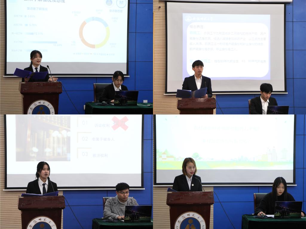 决赛分为选手汇报和答辩、评委提问两个环节进行。各团队代表分别围绕农民工养老、大气污染治理、个人信息保护等社会热点问题以及我国社区矫正现存在问题、认罪认罚从宽制度等法律相关问题进行了精彩汇报和答辩。评委从研究选题、研究内容等角度分别提出了问题及建议。比赛结束后,陈爱如老师代表评委组老师进行了点评。他肯定了参赛选手们较为成熟的调研设计以及认真的调研态度,同时特别指出虽然评委老师言语较为犀利,但这正是获得成长的必由之路。希望通过“创新杯”这一培养学生的重要载体,选手们都能从稚嫩幼苗成长为参天大树。