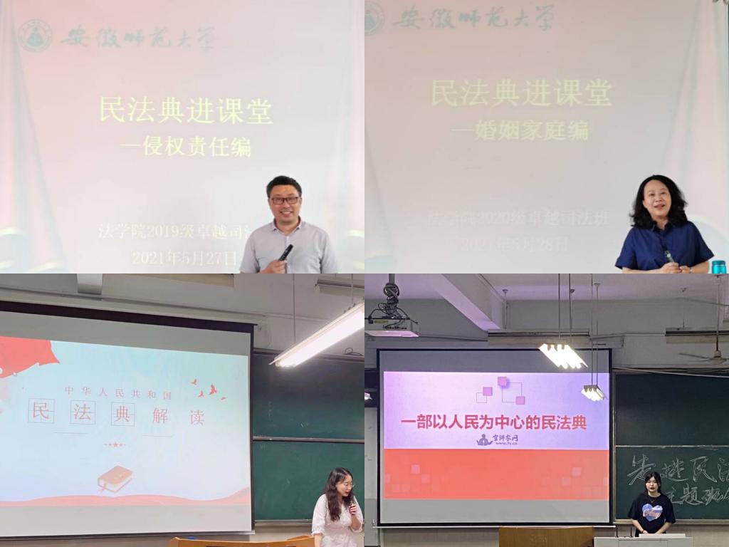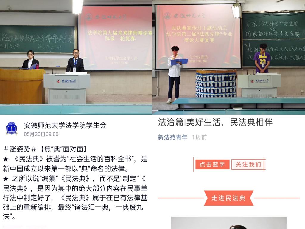 为响应省法宣办、教育厅号召,36365线路检测中心面向青年学子,策划开展民法典主题征文演讲活动;彰显专业特色,未来律师辩论赛、法治微电影、政法故事会、模拟法庭等特色活动融入民法典学习;结合社会实践,暑期多支民法典宣讲主题团队筹备组建。学院青年学子高度重视,积极参与,将民法典知识投入实践运用,化法律条文为防卫武器,维护自身合法权益。