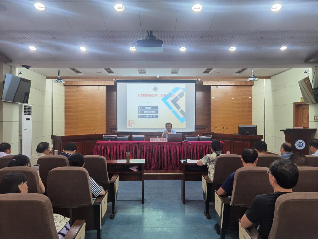 阮成武从分享自己30多年前所创作的“桃花源里可育人”一图入手,向大家分享了“坐如钟”“站如松”“行如风”的教育教学理念,完美契合了大学教师教学、科研和社会服务三大职责,这也与习近平总书记教师节回信所谈到的“高校教师应当将为学、为事、为人统一起来,当好学生成长路上的引路人”是完全一致的。阮成武还强调了大学教师做到“卧如弓”、保持身心健康的重要性。阮成武的报告从大学教师的为学、为事、为人三个部分逐一展开,将大学教师为学、为事、为人的标准和要求凝练概括为“坐如钟”“站如松”“行如风”,并结合习近平给全国高校黄大年式教师团队代表的回信,从“为何”“何为”“为谁”三个角度强调了“为”的重要性,强调大学教师要做“有理想信念”“有道德情操”“有扎实学识”“有仁爱之心”的“四有”好教师,内外兼修,做好学生的引路人。