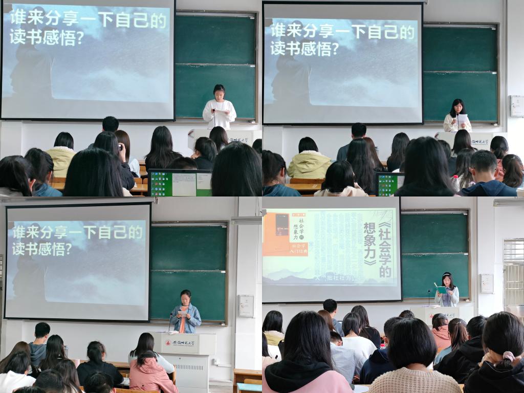 活动过程中,陈霜从写作背景视角出发,并联系所处时代背景说明米尔斯写作的原因;李于茜、郑丽和张子旋则从不同的细节点切入讲述自己所理解“公众参与”与“社会与人的关系”;李倩文从辨析心智与理智分享她对“社会学想象”的理解;盛烨进一步从四个方面讲述社会学想象力的运用;曾梅钦体悟到作者的写作目的是让我们身为社会人应该用特殊的心理认识世界,用灵活机动的方式直面生活并明确漠视、不安的概念;徐妍和许媛表示通过此次阅读,更加深刻了解“历史变迁与社会制度”,我们社会学专业学子应该具有更灵活敏锐的观察力认识社会;最后,李炜锋运用“社会学想象力”的方法逻辑清晰地分析现代网络热点事件,如“男性网友促进会”现象出现的原因,贾中政则进一步运用这一方式提出自己对阅读专业书和考研计划的看法。听完同学们的精彩发言,赵悦针对同学们读书过程中遇到晦涩难懂的问题提出中肯的建议。她鼓励同学们多读名著、多写感悟、多查资料,坚持学习提升,转变读书方法,并建议结合作者处于的时代背景,查阅相关研究文献资料,以便读懂、读通、读好名著。