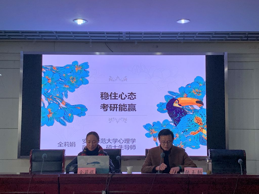 会上,全莉娟从“情绪”“压力”“管理”三个关键词出发,指出情绪是人对客观事物与自身需要之间关系的态度体验,喜、怒、哀、惧等每一种情绪都有其存在的意义,要正确对待和管理考研前的情绪与压力。压力作为一种正常心理状态,是一把“双刃剑”,要养成良好的心态,积极面对考研路上的困难和挫折,通过合理宣泄、积极地自我暗示以及有效放松等方法调节情绪、缓解压力,要善于寻求老师、家长以及专业人员的帮助与支持,要正确理解“幸福”的意义和内涵,全莉娟在最后预祝同学们都能考上心仪院校,一“研”为定。赵红鼓励考研学子要稳住心态,努力拼搏,大家一起同行。会后,赵红、张玉新、高永周、毕业班辅导员共同为考研学子发放了慰问品,并与同学们进行亲切交谈。