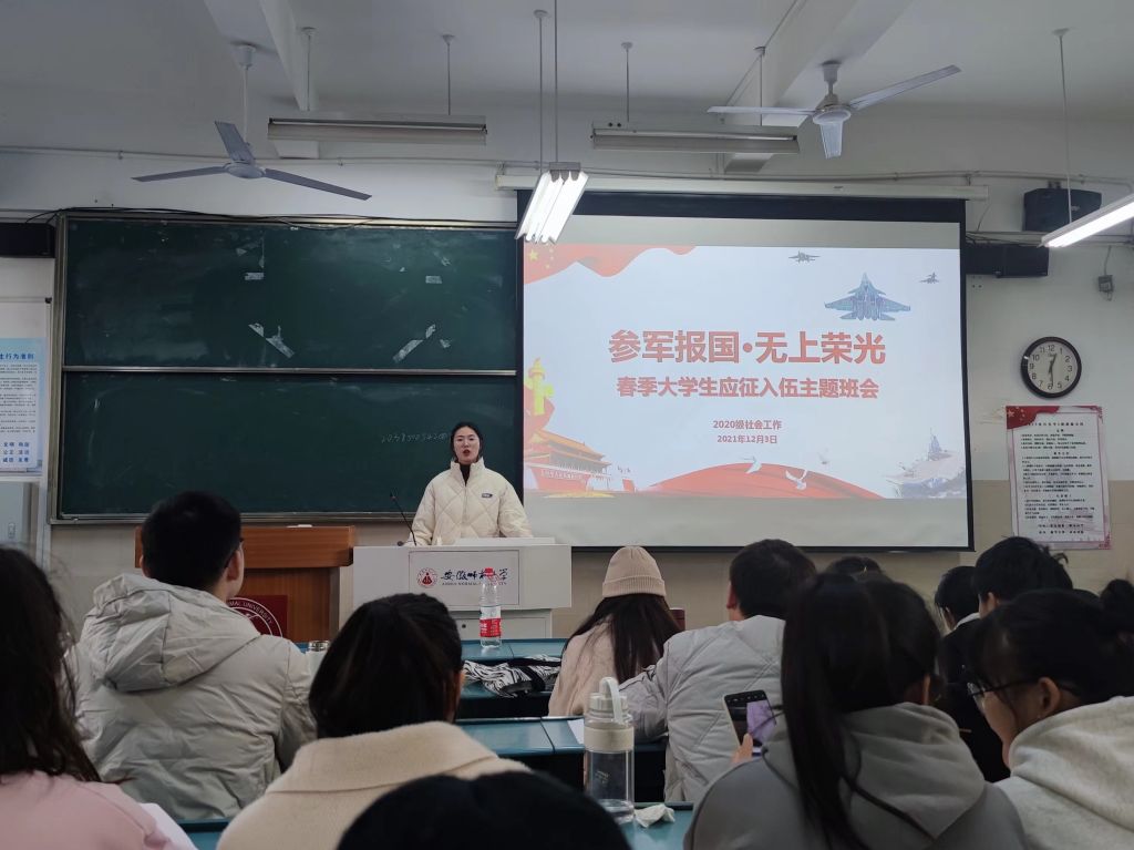 会上,各班组织观看征兵入伍宣传片,辅导员带领大家解读大学生应征入伍相关文件,就应征入伍程序、入伍基本条件等方面展开详细讲解,并结合现阶段国际局势、中美领导人视频会晤等时政热点,向参会同学阐明了参军入伍对保卫祖国、捍卫边疆,实现个人发展的重大意义。会议邀请各班退役复学学生结合自身军旅生涯向参会同学介绍参军理由、入伍流程、退役士兵的优惠政策等,并向大家分享了自己从一名“学生”到“士兵”的不平凡经历。他们号召在座同学应挥洒一腔热血,为实现国家“强军梦、强国梦”贡献力量。退役复学学生用自己的亲身经历和切身感受让参会同学了解到军营生活的多姿多彩以及大学生参军报国的重大意义,希望同学们积极响应国家号召,参军入伍,在国防建设中磨砺品质、出彩人生。