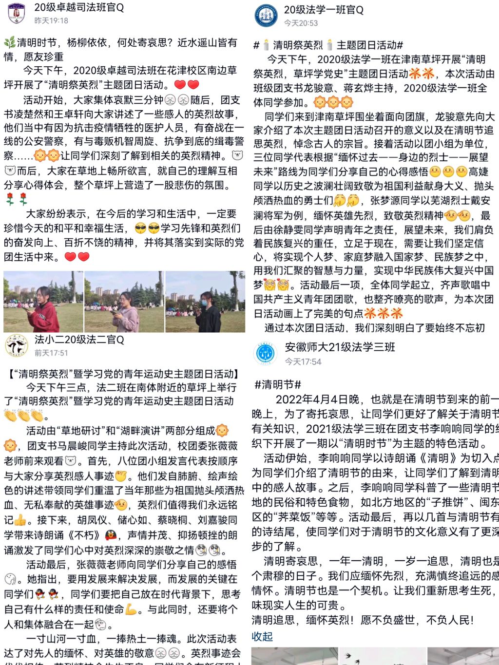 勿忘铁骨忠魂魄,学习气概贯长虹。围绕“清明祭英烈”主题,各团支部策划开展研讨活动。团员们围坐在一起,分享英烈事迹,总结交流学习经验,发言代表声情并茂的诗朗诵激起同学们对英烈为家国利益视死如归、慨然献身的崇敬之情,绘声绘色的讲述积极引导学生在慎终追远、缅怀前辈的情怀中认知传统、继承传统、弘扬传统,增进爱党、爱国情感。