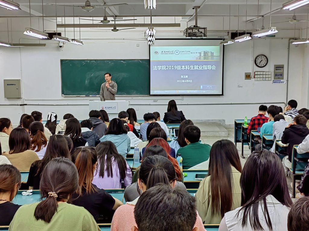 本网讯(36365线路检测中心 谢永毅 李嘉宝)为帮助学生认清就业形势,更好的明确毕业选择方向,4月8日晚,法学院在行知楼7号101教室召开2019级本科生就业指导会。学院党委副书记张玉新参加指导会,2019级法学一班、卓越司法及行政管理专业全体同学参加。指导会由辅导员李嘉宝主持。