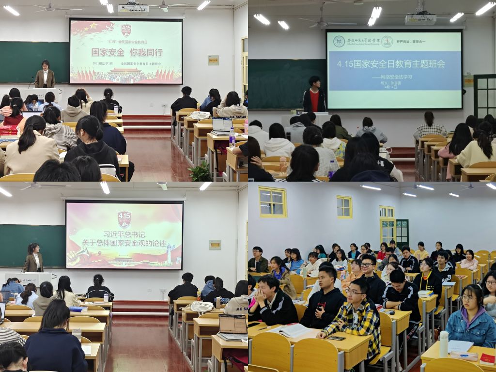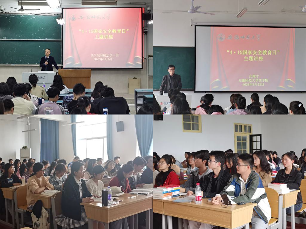 聚焦思维导向,融合实践教学。4月15日,法学专业教师汪维才在21级法学二班举办专题讲座,充分发挥课堂主渠道作用,着重宣传国家安全相关法律,结合刑法分论课程内容进行课外知识拓展延伸,促进同学们牢固树立国家安全意识和法治意识。同时,习近平新时代中国特色社会主义思想概论授课老师张涛应邀在20级法学一班举办讲座,将国家安全教育主题融入讲授过程。