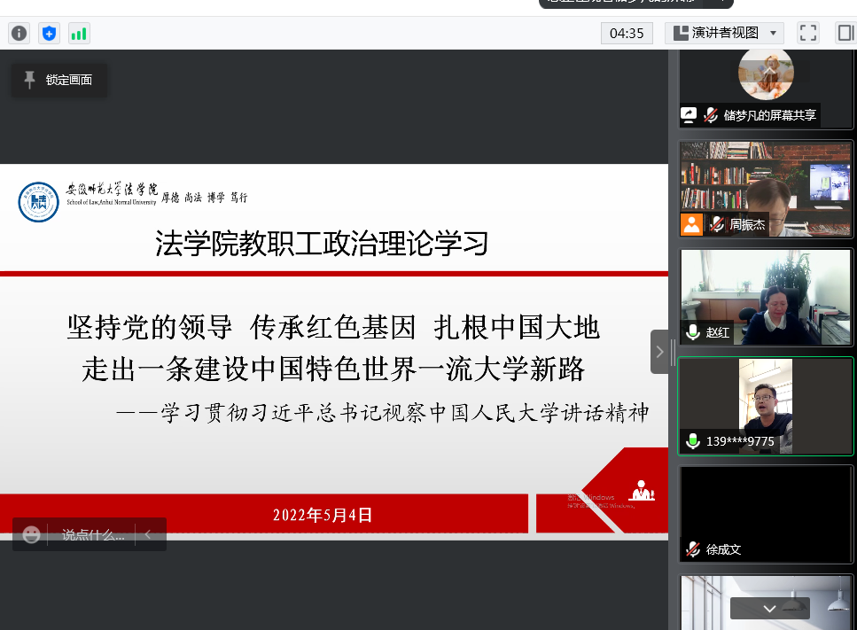 党委副书记张玉领学了习近平总书记视察中国人民大学的讲话精神。习近平总书记在考察中指出,要坚持为党和人民事业服务,落实立德树人根本任务,传承红色基因,扎根中国大地办大学,走出一条建设中国特色、世界一流大学的新路。张玉新从习近平总书记的“思政课的本质是讲道理”出发,号召全院教师贯彻落实课程思政育人理念,立德树人,共同做好学生培养工作。张玉新还传达了习近平总书记关于建构中国自主的知识体系、做精于“传道授业解惑”的“经师”和“人师”的统一者、坚定不移听党话跟党走等讲话精神。