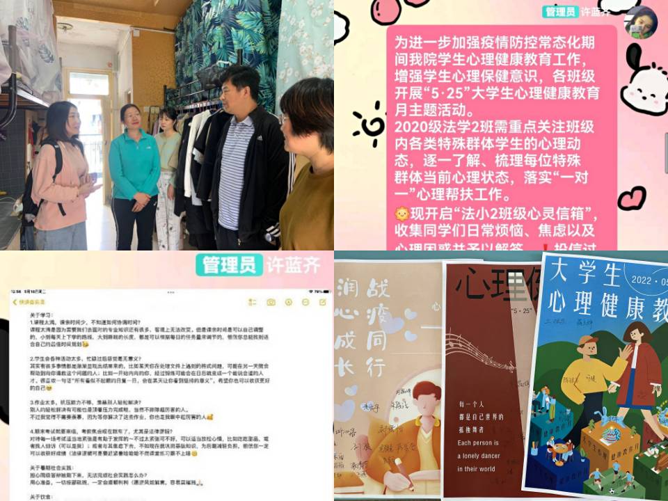 线上线下同频交流,细致排查心理状况。“五一”假期期间,院党委书记赵红、副院长李光宇在辅导员代表和班级心理健康委员的陪同下深入寝室,与同学们展开亲切交流,了解同学们的心理健康状况,并对同学们的相关困惑,针对性的提出了建议与指导,真切落实“一对一”心理帮扶工作,在与学生的沟通交流中把握心理健康教育诉求。同时,各班心理委员通过线上线下结合的方式,逐一了解、梳理班级中特殊群体当前心理状态,并积时给予关心与帮助。通过进行精细化心理状况排查,有效预防突发性心理危机事件,并就存在心理危机的学生及时干预,提升了同学们心理健康素养。