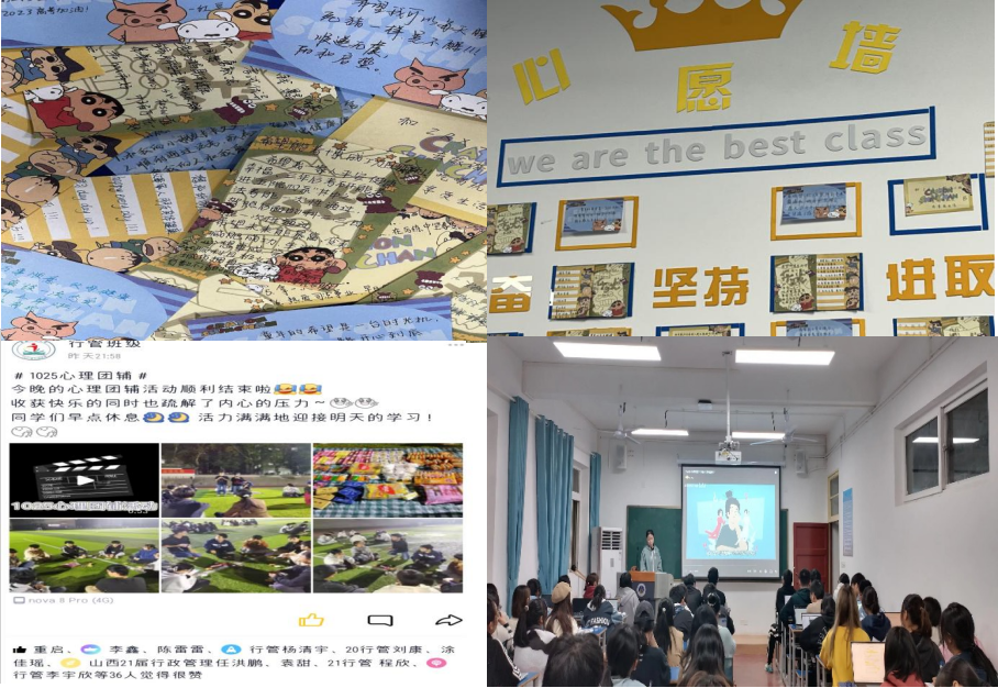 共话心理安全教育,同护心灵茁壮成长。结合新生心理测量工作,辅导员积极联系学生,依托心理咨询室,开展约谈活动,与同学亲切交流,了解学生心理健康状况,切实落实“一对一”帮扶工作。同时,心理健康委员结合实际情况,以班级为单位开展多样化帮扶工作,点面结合,开展心理健康教育主题活动,建立心理健康小组,细致梳理排查班级心理状态,通过“小组共话”“心灵漂流”“共建心愿墙”等方式给予学生关心与帮助。同学们积极有序参与,在倾诉烦恼的同时,增强与其他同学的情感交流,拉进同学间的距离,传递正能量,营造和谐友爱、互帮互助的良好班级氛围。