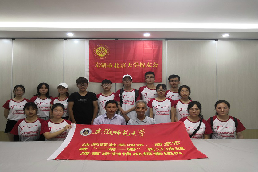 团队在指导老师李路根的带领下前往芜湖深蓝律师事务所进行调研并在事务所创始人之一谢长根老师的主持下展开关于“芜湖将设立海事法庭”的意见指导座谈会。谢律师主要介绍了有关芜湖海事审判庭设立的前景,他谈到水上运输货物的方便、实惠和芜湖处于优良港口的位置,多河流等条件将会促进海事审判庭在芜湖设立,以及在海事审判庭设立后将会进一步促进芜湖经济的发展。与此同时,团队人员与谢律师进行交流互动,同学们就海事审判的相关疑惑对谢律师进行提问,谢律师都予以一一解答。最后,谢律师以一个老师的身份教导团队同学学习法律应该不忘初心,牢记自己的任务,坚守做人的底线。座谈会结束后,全体人员合影留恋。