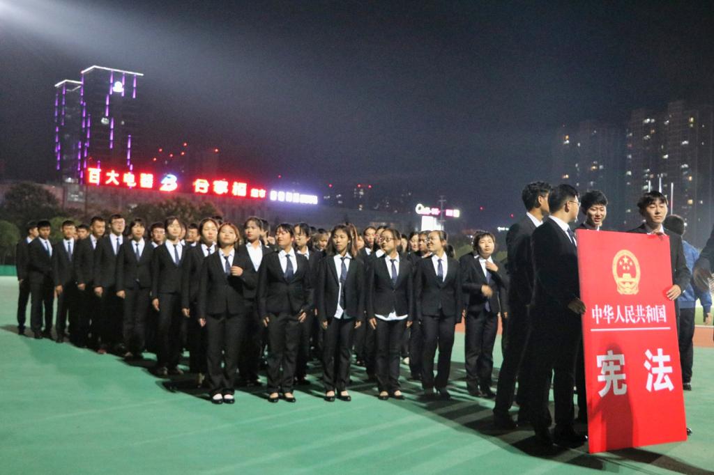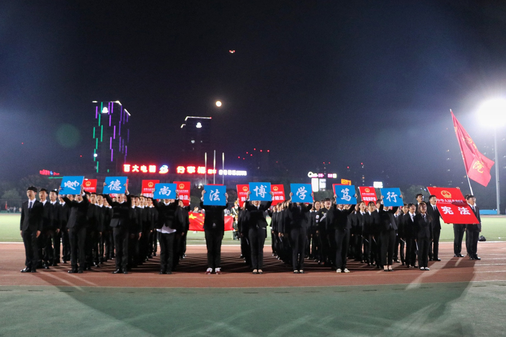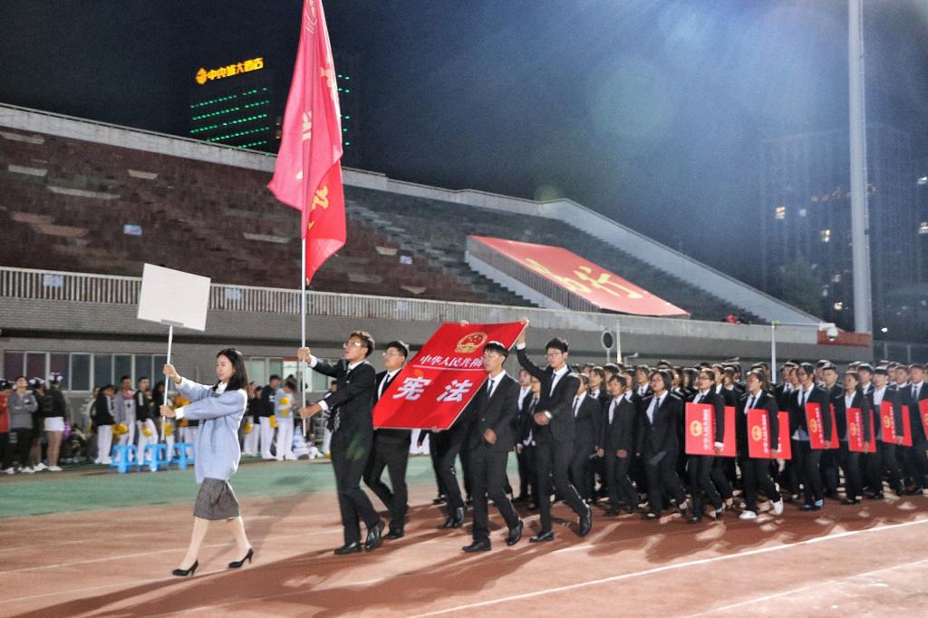 10月15日晚,36365官网方阵队在花津校区北体育场进行彩排活动。秋风与桂花相绕,阵阵花香扫去一身训练的疲惫。集合整队,彩排正式开始,队员们昂首挺胸,神采飞扬,迈着铿锵有力的步伐向看台走来,嘹亮高亢的口号让夜晚也跟着沸腾。最前排的队员高举“中华人民共和国宪法”,两列的队员手持“中华人民共和国合同法”,“中华人民共和国婚姻法”等富有法苑特色的法律标牌。“厚德、尚法、博学、笃行”八字是法苑学子不懈的追求,更是彰显了36365线路检测中心厚重的人文底蕴。队员们双目炯炯有神,脚步坚定有力,声音慷慨激昂,道出青春的璀璨,充分彰显了法苑学子的风采。