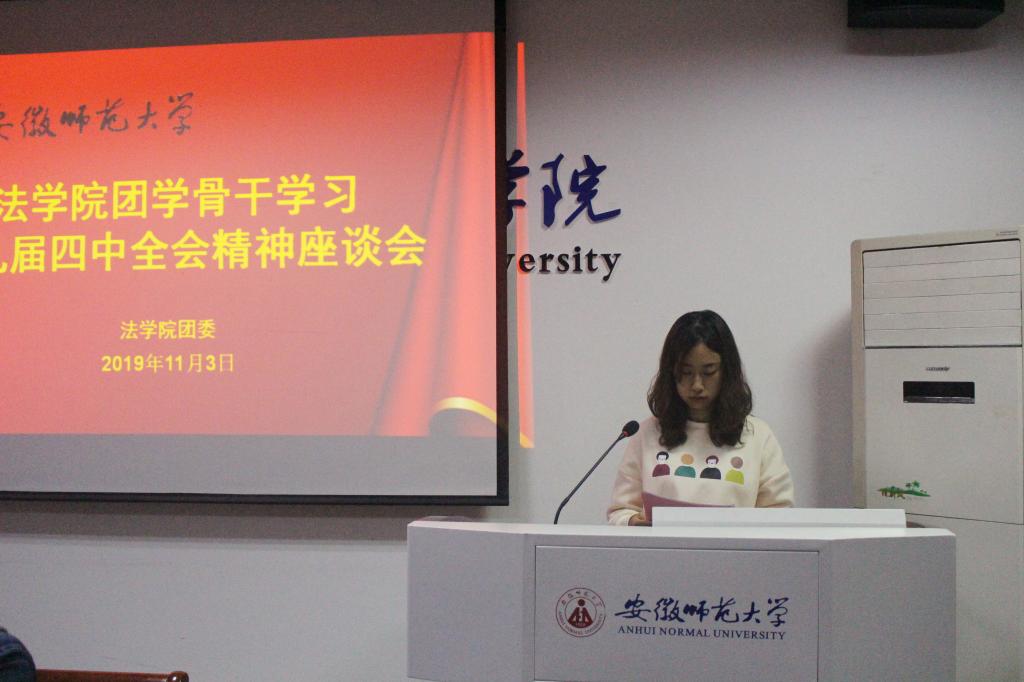 会议伊始,何新宇给团学骨干播放了与十九届四中全会精神相关的视频资料。随后黄雅倩介绍了十九届四中全会的基本知识,并由何新宇介绍了十九届四中全会公报的主要内容。与会人员结合视频资料与自己的所感所思踊跃发言。团委组织委员胡亚楠说到,对于一个共青团员来说,无论是在工作中还是学习上,保持自信与居安思危的心态是十分有必要的。要对自己有一个全面的认识,学会扬长避短而不是自我否定,在工作中取得了一定的成绩时也不能沾沾自喜而是要时常进行反思。学生会办公室主任郭怡认为,青年学生应该有一个全面的大局意识,锻造改革创新的能力,保持一个自信的心态,不断反思从而做到一个自我革命。团委社团工作委员许芳芳结合近期的热点事件谈到,法学生不应在网上发表不良的言论,要时刻保持清醒的头脑,坚定不移地支持“一国两制”的道路。