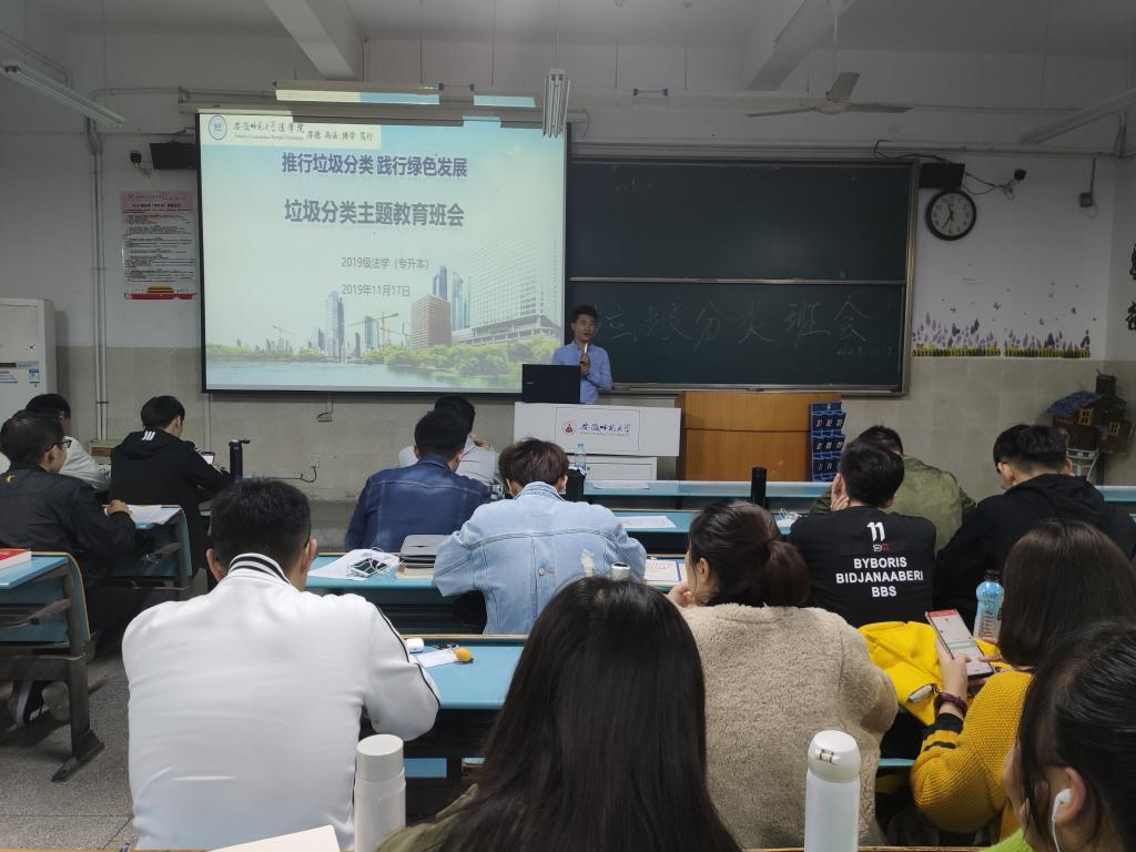 2019年11月17日晚19.00,36365线路检测中心2019级法学专业(专升本)在行知楼1号楼304教室召开垃圾分类教育主题班会。会议由班长张诚主持,全体2019级法学专业(专升本)同学参加。