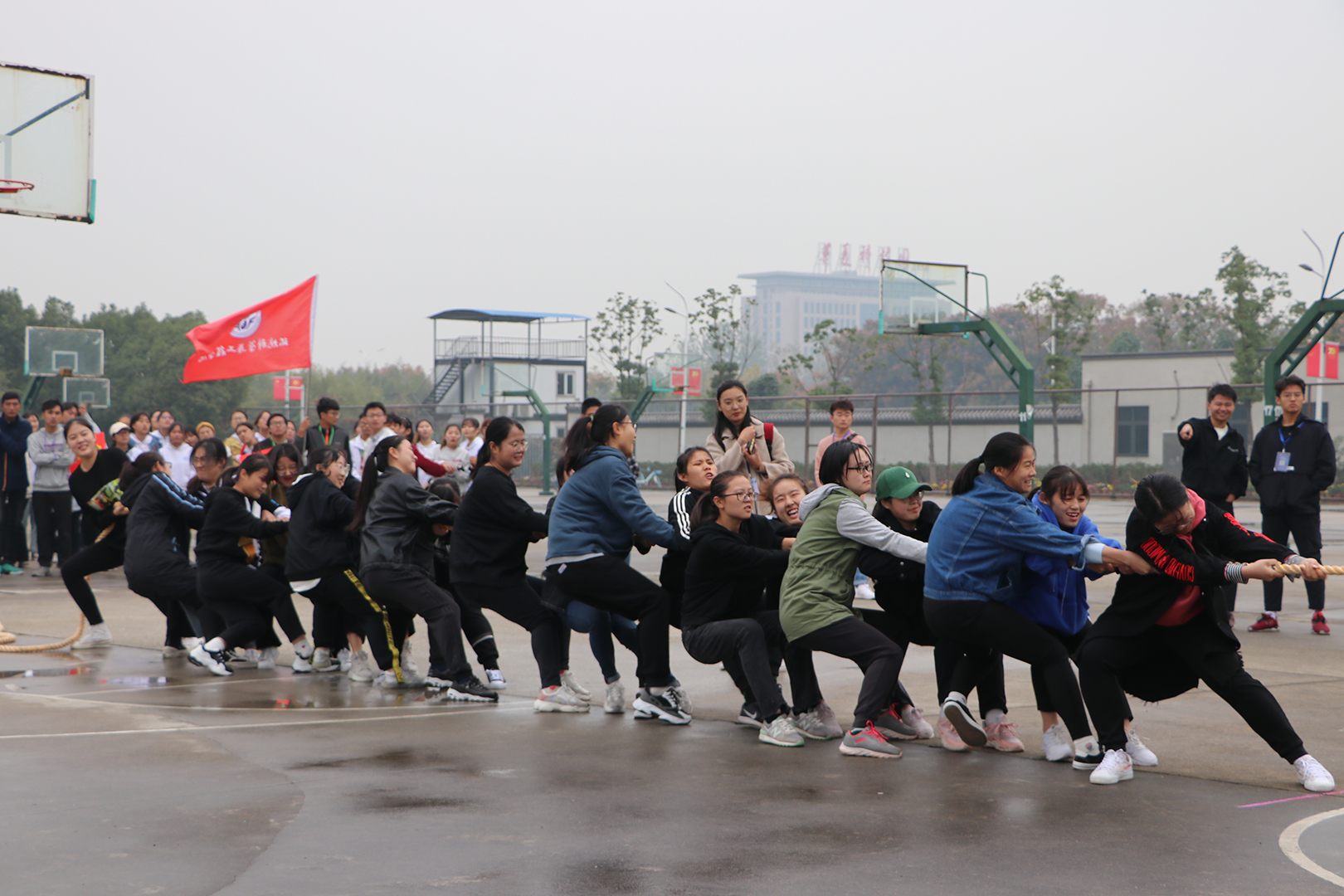 11月17日下午,校第十三届“铿锵玫瑰”女子拔河比赛于南体育馆的篮球场如期举行,36365官网女子拔河队员和学生会相关工作人员准时到达比赛现场。比赛采用三局两胜制,分三轮进行。经第一轮组内单循环赛,第二轮淘汰赛后,由第三轮单循环积分赛决出最终名次。