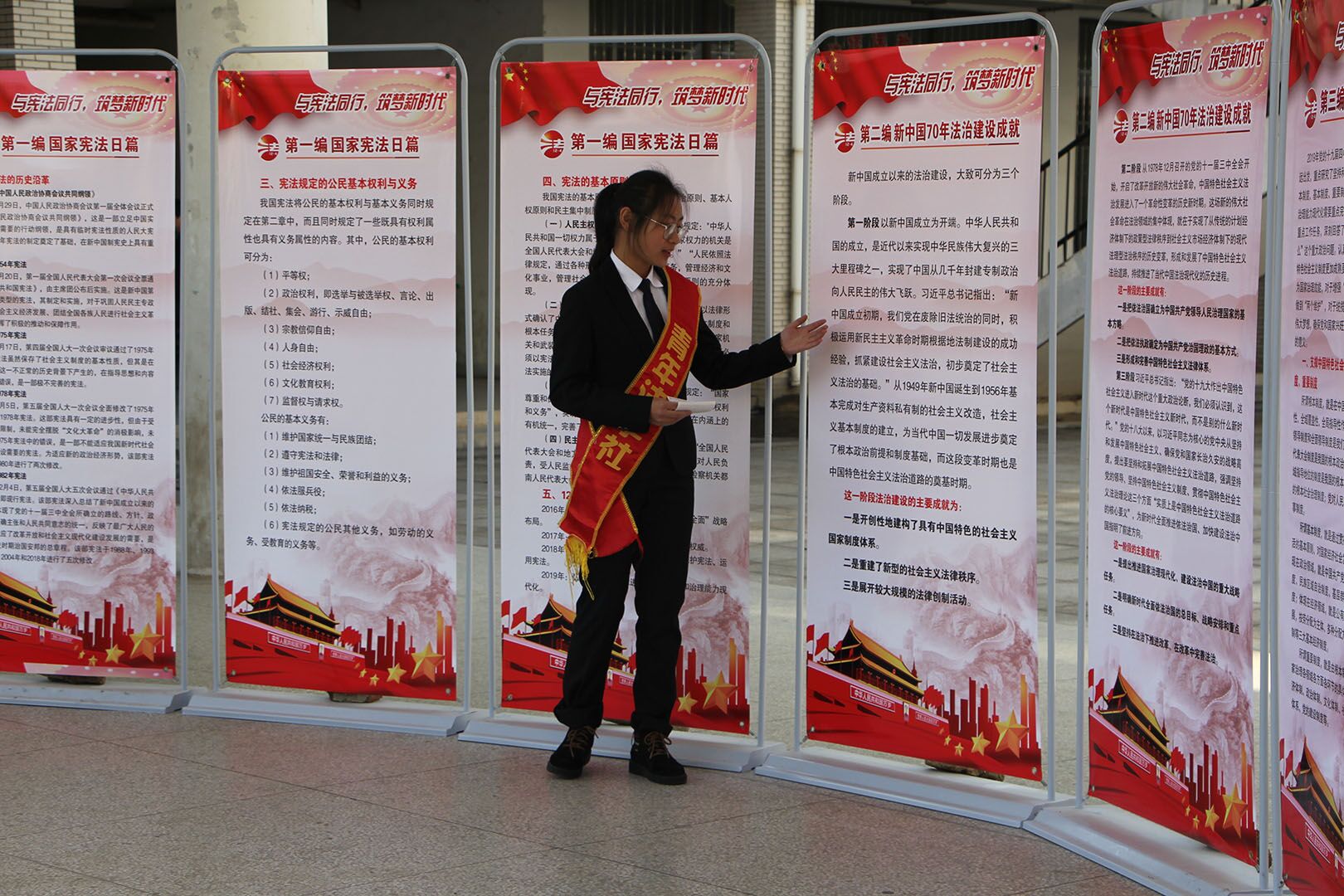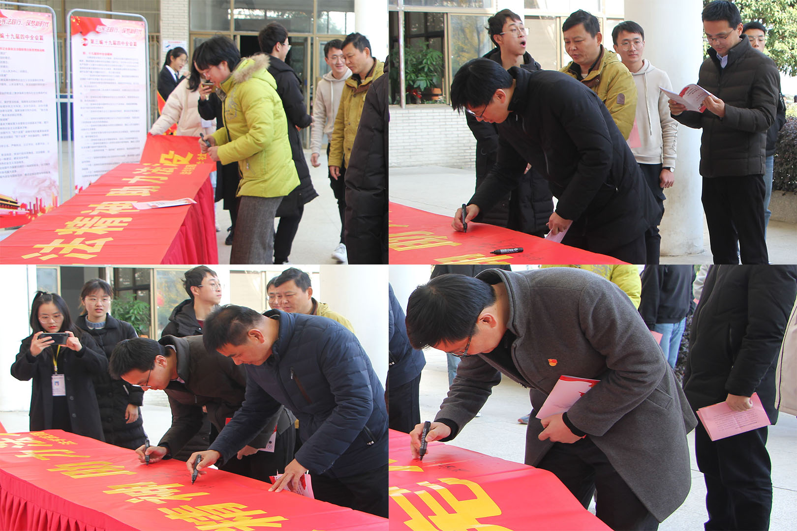 活动伊始,青年法学社宣讲团代表徐欢忠、王可然等向老师和同学们介绍了与国家宪法日相关的内容,如宪法的历史沿革、宪法的地位和作用、宪法的基本原则以及12.4国家宪法日的由来、主题和设立目的等。宣讲员从三个阶段对新中国70年法治建设成就作详细讲解,第一阶段以新中国成立为开端,第二阶段从1978年12月召开的十一届三中全会开始,第三阶段自党的十九大开始至今。随后宣讲员重点介绍了中国特色社会主义制度的根本制度、基本制度和重要制度、习近平新时代中国特色社会主义思想和全面依法治国新理念新思想新战略,并讲述了十九届四中全会的主要内容。宣讲结束后,老师们在横幅上签名,并和同学们合影留念。
