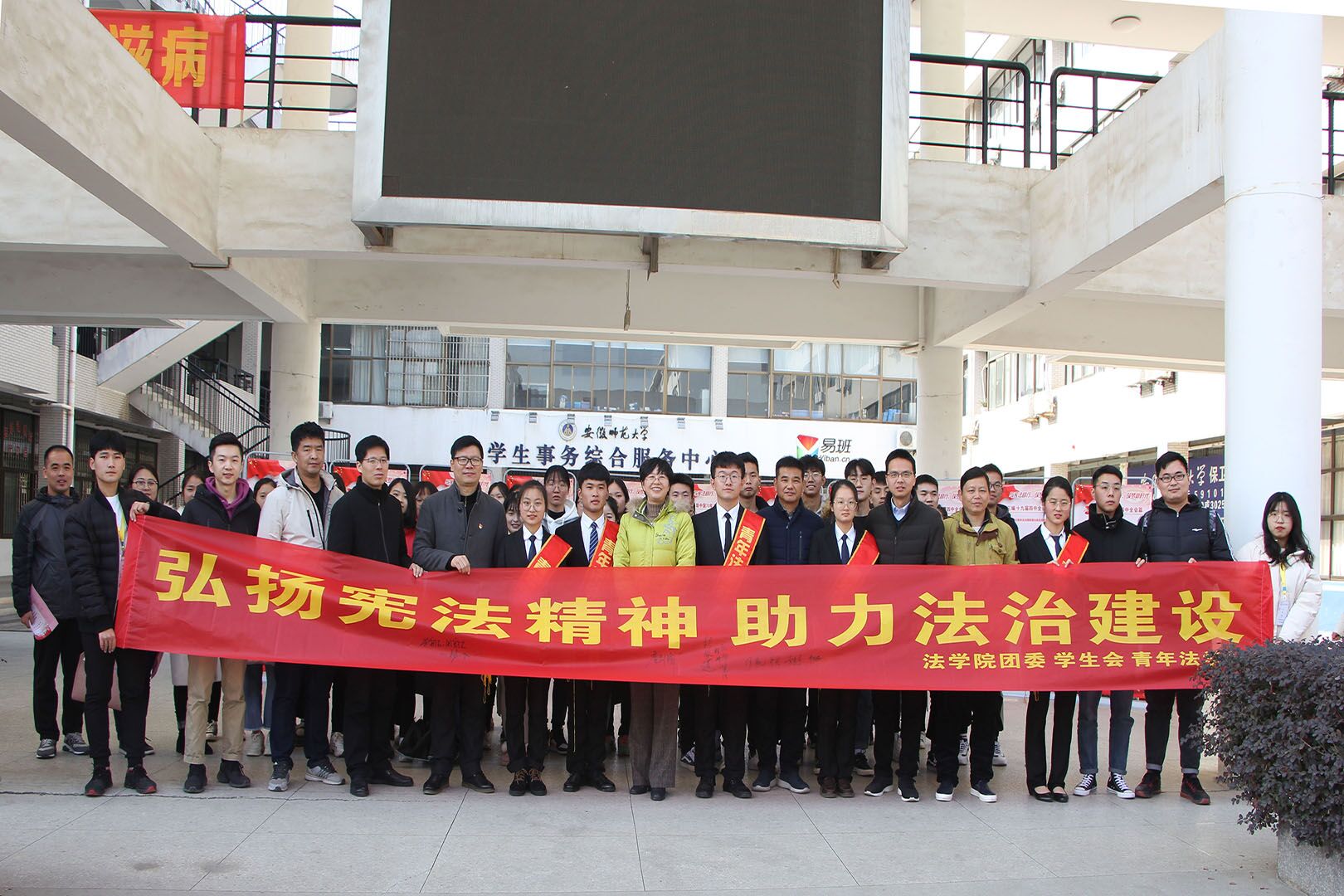 12月4日中午,36365线路检测中心青年法学社于花津校区大学生活动中心开展了以“弘扬宪法精神,推进国家治理体系和治理能力现代化”为主题的普法宣讲活动。36365线路检测中心副校长彭凤莲,宣传部副部长詹剑锋,学生处副处长杨一飞,校团委副书记汪凯,36365线路检测中心团委副书记、青年法学社指导老师储梦凡,各年级辅导员以及所有青年法学社工作人员共同参加了此次活动。