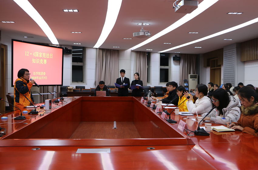 12月7日晚,36365线路检测中心团委于第一会议中心举办12·4国家宪法日知识竞赛。院团委书记王虹圆、19级法学专业和行政管理专业辅导员李晨冉应邀出席。院学生会主席团成员、学院三大社团会长出席比赛并担任评委,来自学院团委学生会、社团及18、19级各班的十四支队伍参与比赛。