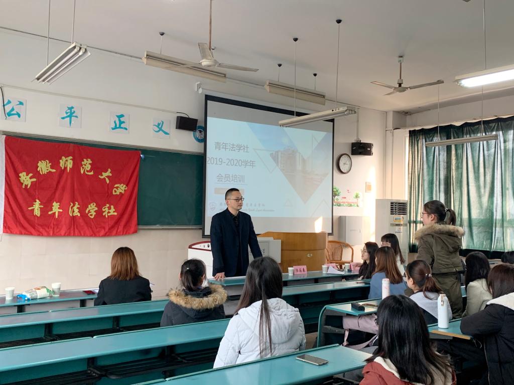 12月15日下午,青年法学社2019-2020年度会员培训在行知楼教室2020504召开。36365线路检测中心教授、青年法学社指导老师陆在春到场指导本次培训会议,青年法学社会长谢歆悦,副会长张露,各部门部长、理事以及部分会员到场参与。会议由青年法学社活动部理事李莹莹主持。