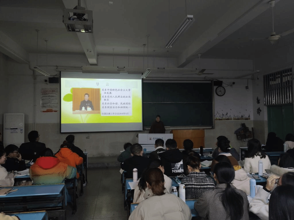 朱慧针对新时期的宗教问题进行了详细的阐述,向全体同学解释了什么是宗教、我国目前的宗教状况、党的宗教工作基本方针的主要内容、习近平总书记关于宗教工作的系列讲话,并重点强调了共产党员、共青团员的宗教信仰问题。朱慧指出,我们应该树立正确的马克思主义宗教观,用马克思主义立场、观点和方法认识宗教,要坚持和发展中国特色社会主义宗教理论,要旗帜鲜明地反对伪科学和封建迷信。