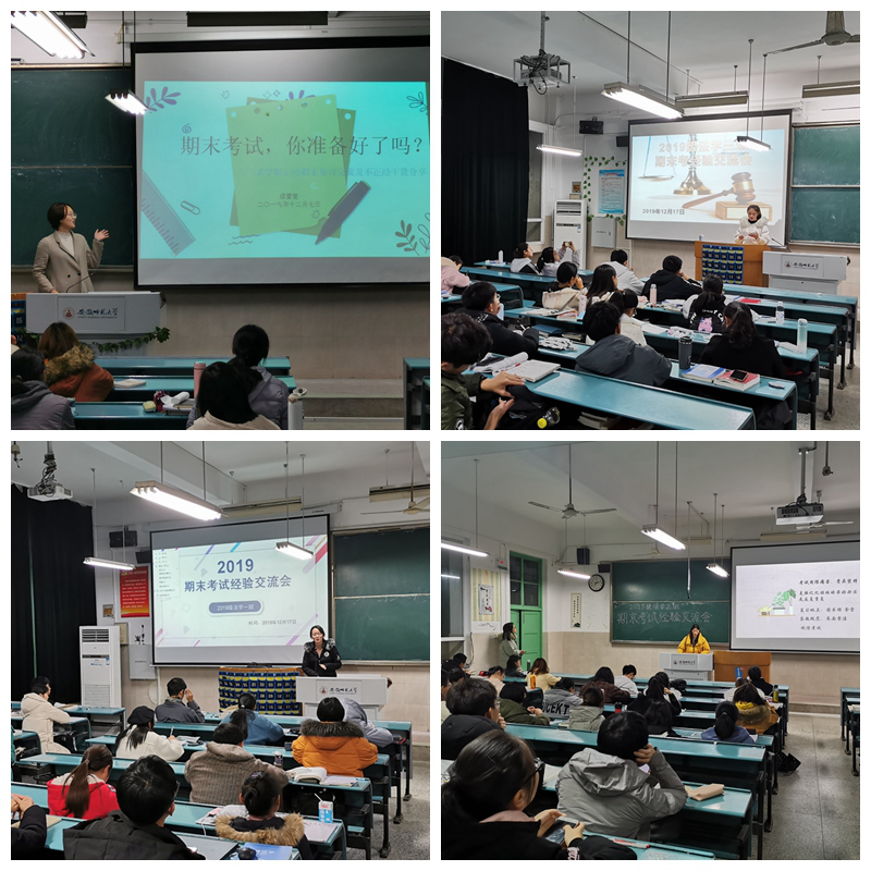 常言道:“行百里者,半九十”,最后一段路往往是最艰苦难行的。期末将至,为发挥朋辈引导作用,帮助同学们缓解考试焦虑,使大一新生尽快了解考试形式、掌握科学有效的复习方法。12月17日晚,2019级法学、行政管理专业分别邀请到了2018级卫苏、李小萍、吴梦婷、缪雪莹四位优秀学生代表为同学们进行期末考试经验交流。