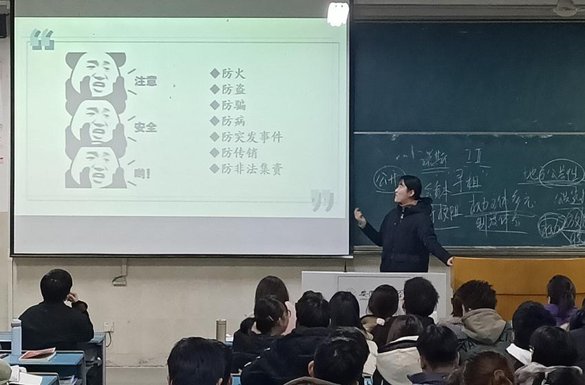 会议伊始,冯晟从七个“防”开始讲解假期安全注意事项,告诫同学们要防火、防骗、放盗、防病、放突发事件、防传销、防非法集资,如兼职时注意签合同。其次,她还从衣食住行四个方面,提醒同学们假期要注意保暖,不要暴饮暴食,室内要经常通风换气,出行在外乘坐具有合法资质的车辆。此外,她建议大家假期期间要多看书,自觉学习知识,并且要养成良好的生活作息,不能经常熬夜,完成寒假期间的作业。最后,冯晟强调了返校注册报到时间为2月15号,提醒同学们要按时到校。