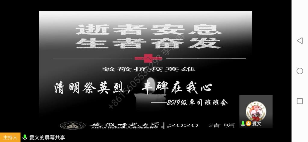 会议最后,辅导员李晨冉老师总结发言,同时表达对于每位同学在班会中热情发言的肯定,并和同学分享疫情以来居家工作的感受以及对每位同学在学习方面的期盼,让我们感受到卓司班大家庭的温暖。疫情无情,人却有情,让你我共同缅怀逝人,不负他们用生命换来的安宁!最后,也希望全球疫情能早日得到控制,愿全人类能早日过关。