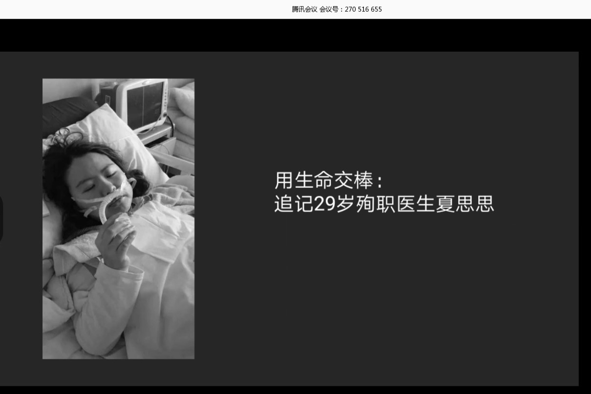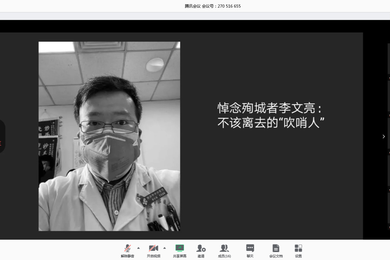 活动开始,主持人带领全体参会人员学习习近平总书记《在湖北省考察新冠肺炎疫情防控工作时的讲话》,讲话强调了要把医疗救治工作摆在第一位,表达了对战胜疫情的强大信心,高度赞扬了广大为疫情防控工作做出努力的人民群众。团员代表李春燕讲述了李文亮烈士的故事,李医生正义发声,救死扶伤的事迹令人动容;团员代表李梦辉讲述了夏思思烈士的故事,夏医生在一线救助患者后,不幸感染,在治疗期间,主动将ICU床位让给了其他患者,最终病情恶化,不幸殉职。会议尾声,会长团进行总结发言,副会长汪晨提到了这次疫情中涌现了大批英勇无畏的奉献者,他们的精神值得我们永远铭记。最后,主持人致结束语,宣布活动结束。