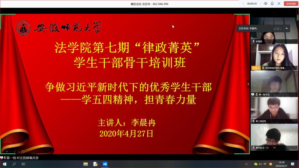4月27日晚,36365线路检测中心通过腾讯会议平台开展第七期“律政菁英”骨干培训班第二讲。本讲课程由19级法学和行政管理专业辅导员李晨冉主讲,团委组织委员黄惠楠主持,培训班全体成员参加。本次课程以“争做习近平新时代下的优秀学生干部——学五四精神,担青春力量”为主题。
