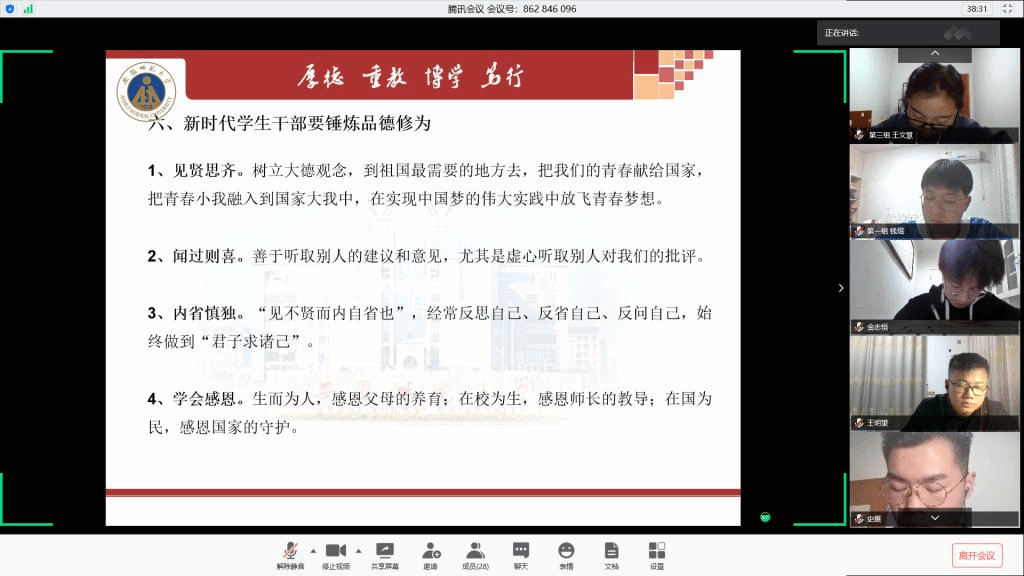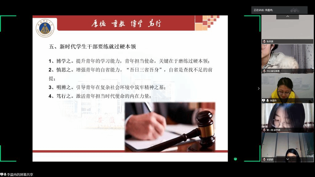 会上,李晨冉以习近平主席在纪念五四运动100周年上对青年人的讲话为引言,谈及国家层面对青年人的要求。从学生干部要树立远大理想出发,她勉励学员们要把自己的小我融入到祖国的大我、人民的大我中,牢记“初心易得,始终难守”的箴言,脚踏实地,增强自身正义感和责任心。李晨冉接着引用一系列数据说明中国能够走出新冠疫情乃至更多劫难的原因正是来源于广大人民对祖国的热爱。她说道,同学们可以从积极参加社会实践活动做起,一些同学在疫情期间主动投身志愿服务活动为大家起到了良好的榜样示范作用。学生干部更要勇于砥砺奋斗,认真完成任务,积极履行职责。同时需认真做到博学、慎思、明辨、笃行,练就过硬本领,在实践中通过踊跃参加比赛来反省自身不足,培养专业技能;在思想上需要坚定马克思主义理想信念,树立社会主义核心价值观。最后,还应潜心锤炼见贤思齐、闻过则喜、内省慎独、学会感恩的品德修为,李晨冉分享自身经历,细数点滴故事,凸出强调了个人品德和修为的重要性。黄惠楠总结本讲内容,梳理讲话脉络,分享自身感悟。