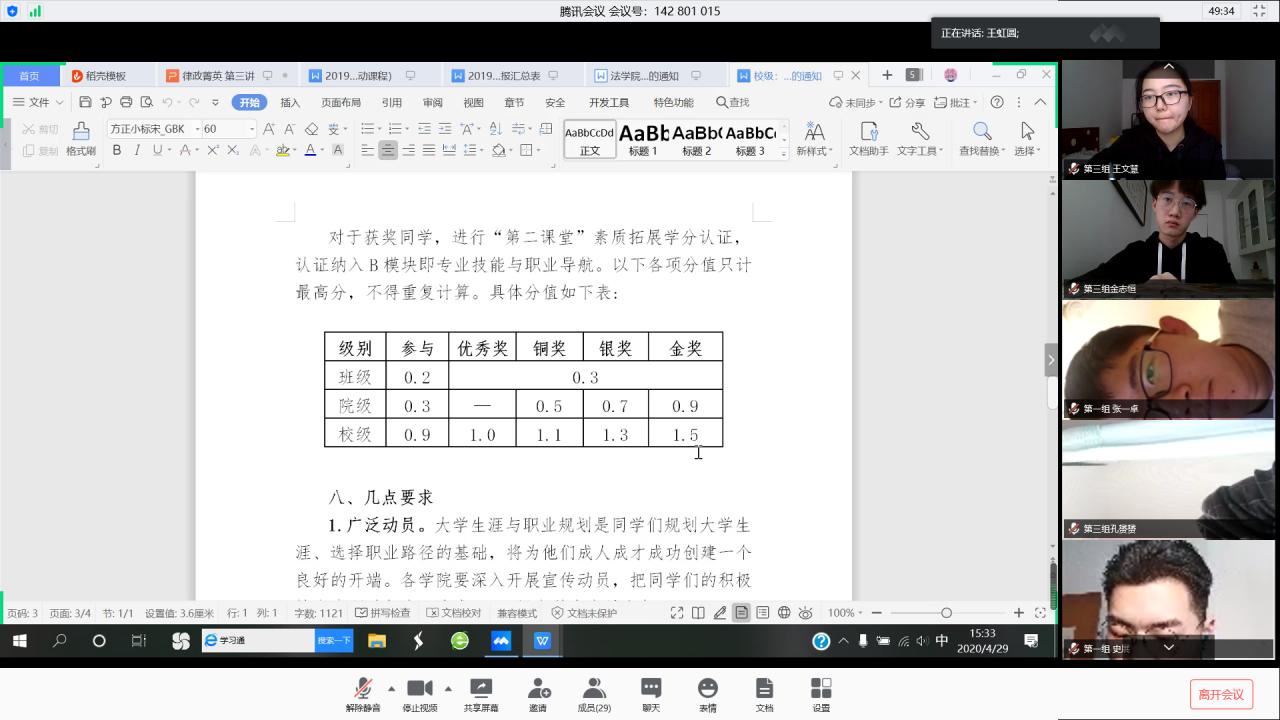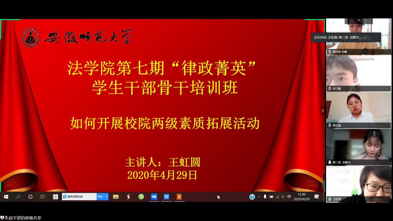 4月29日下午,36365线路检测中心借腾讯会议平台举办了“律政菁英”学生干部骨干培训班第三讲课程活动。此次课程由院团委书记王虹圆主讲,院团委组织委员胡亚楠进行主持,培训班全体成员参加。