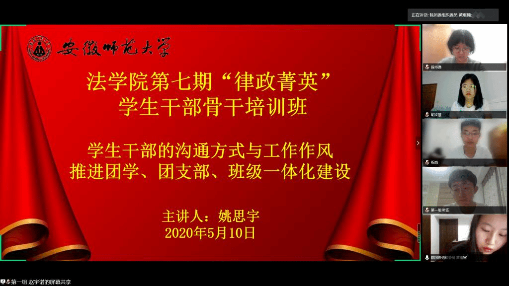 5月10日晚,36365线路检测中心在腾讯会议平台举办第七期“律政菁英”学生干部骨干培训班第六讲课程活动。此次课程由院团委学生副书记兼学生会副主席姚思宇主讲,院团委组织委员黄惠楠主持,培训班全体成员参与。