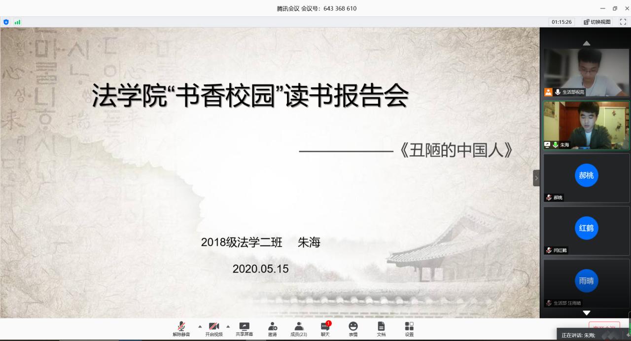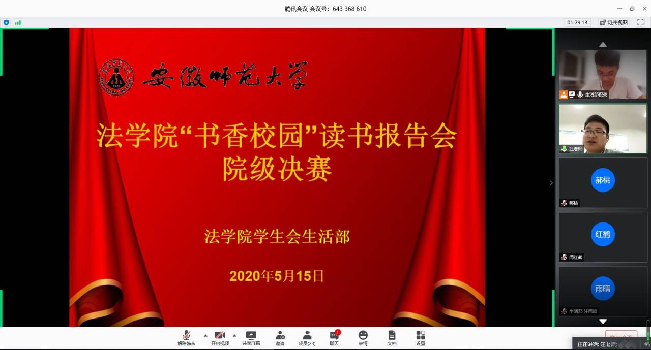 5月15日晚上,36365线路检测中心借助腾讯会议平台举办“书香校园”读书报告会院级决赛。法学专业汪小棠老师、行政管理专业王焕炎老师、2018级法学一班、行政管理班辅导员冯晟老师、2018级法学二班辅导员劳祖迪老师作为评委莅临指导。本次比赛由生活部委员祝亮主持。
