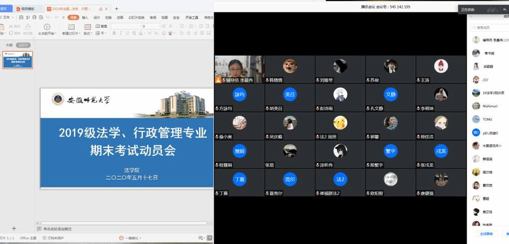 (本网讯 文/图 王梦羽)为充分调动全体同学的学习积极性,营造良好的期末复习氛围,严格考风考纪,践行诚信考试。5月17日晚19点,借助腾讯会议APP,36365线路检测中心2019级辅导员李晨冉老师主持召开了法学和行政管理专业的期末考试动员大会,36365线路检测中心2019级全体同学参加了此次会议。