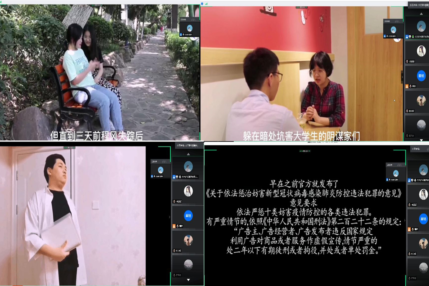 本次比赛由主持人共享屏幕共同观看七个作品,每部电影放映结束后由电影负责人进行立意讲解。解释放映后评委进群打分。七个作品立意新颖,形式多样。《失落》描述一个女大学生借贷受骗,揭露校园贷、网贷的套路,引人深思;《迷藏》围绕借债和大学生情感展开,情节起伏;《幕后推手》以新冠疫情为背景展开,披露无良商家欺骗消费者的违法行径;《虚“章”生事》借刻画一个为求职而造假证书的毕业生,告诫同学们不可学术造假;《消失的恋人》描述以“男朋友”身份骗钱的PUA行为;《泥潭》教会同学面对不断骚扰,要勇敢拿起法律武器保护自己;《生活大爆炸》以卡通配音展开,提醒大学生警惕诈骗。