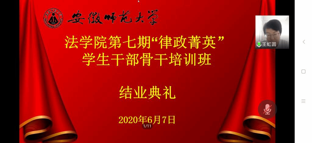 6月7日下午,36365线路检测中心借腾讯会议平台举办了第七期“律政菁英”学生干部骨干培训班结业典礼。本次活动由院团委组织委员胡亚楠主持,院团委书记王虹圆、院团委学生副书记兼学生会副主席姚思宇、培训班全体学员参与了活动。