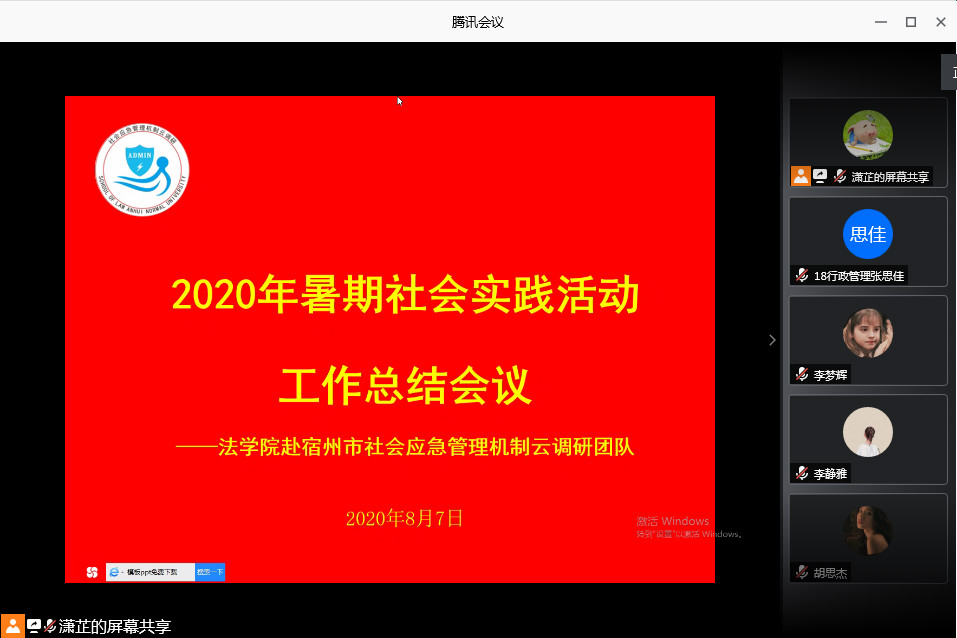 8月7日,团队队长屈祥珍于腾讯会议召开暑期社会实践工作总结会。在会议上,队长总结了前期团队工作内容,向队员展示团队工作成果与相关材料,并对这段时间队员的工作表示肯定。工作总结会议的结束宣布了本团队暑期社会实践活动的正式结束。