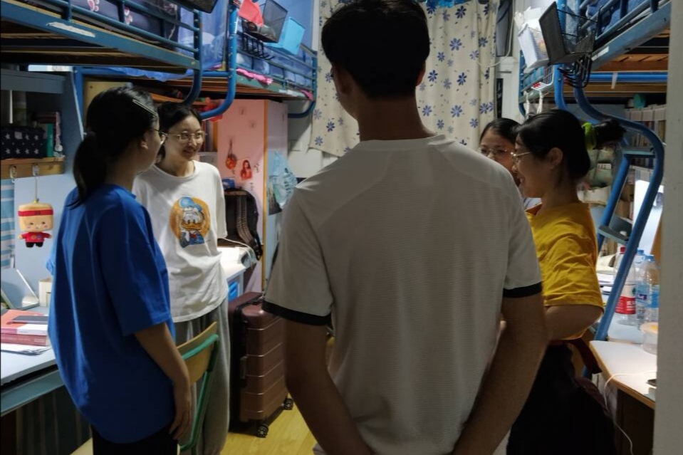 最后,为进一步增强学生疫情防控意识、心理建设和文明寝室建设,张楠楠走进学生寝室,认真排除安全隐患并与学生进行亲切交谈,了解学生现行忧虑与问题,并给予相应建议。他对同学们提出了期许:进入大三,心中要有理想与现实,定好学习或就业的目标,提前谋划,提高自己,才能走向更广阔的未来。