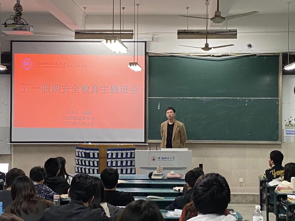 (本网讯 崔健)五一假期将至,为了强化安全教育主题,提高同学们的安全防范意识、树立正确的消费观念,4月27日晚,20级法学专业辅导员崔健在教学楼召开了五一假期安全教育主题班会。2020级法学专业全体同学共同参与。