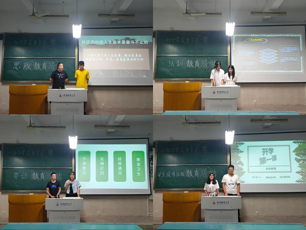 班会伊始,刘金金对上一学年班级情况作出总结,并就开学的综测工作、班级的日常管理、学期的规划安排进行相关说明,督促同学们新的学期要严于律己,追求进步。随后,班会围绕思政、法制、劳动、安全四个模块开展。在思政教育方面,团支书陶子、陈梦熙讲述了“禾下乘凉梦”的故事,勉励同学们要有高尚的人生追求,并且为之奋斗;在法制教育方面,文艺委员吕典、许思佳从幽默小视频引入,介绍了民法典及其颁布的意义,引导同学们树立法制观念;在劳动教育方面,生活委员梁詠岚、朱瑞中强调了寝室、教室卫生与秋季传染病防治等问题,鼓励同学们为创造绿色健康校园共同努力;在安全教育方面,安全委员康勐祎、陈美钿就防疫安全、网络安全、食品安全等问题为大家敲响警钟,提醒同学们始终要把安全问题放在首位。