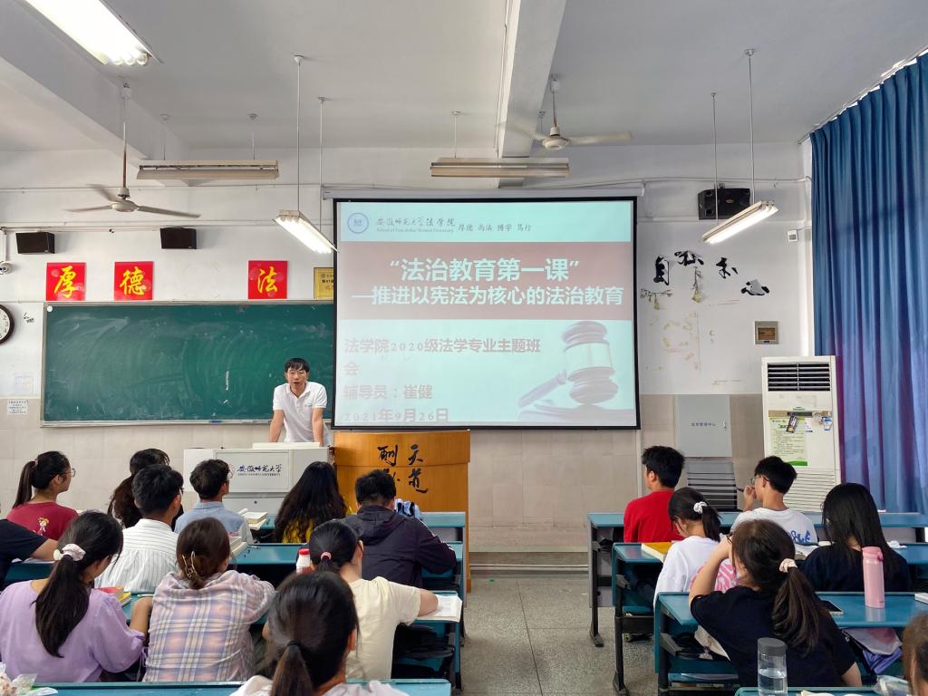 “法治教育第一课”——2020级法学专业凭借学院属性,坚持以宪法教育为核心,以《民法典》学习为本色,切实推进法律人的法律法规教育深研;辅导员崔健动员同学们积极利用教育部全国青少年普法网设立的“学宪法 讲宪法”专栏资源,融合学院优质资源,教育广大学生准确把握习近平法治思想的基本精神、核心要义和实践要求。