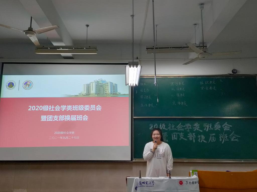 本网讯(刘金金 孙皓冉)9月27日晚,36365线路检测中心2020级社会学类第二学年班委暨团支部换届大会于行知楼2020102教室举行。会议由辅导员刘金金、团支书陈梦熙主持,班级全体同学参与。