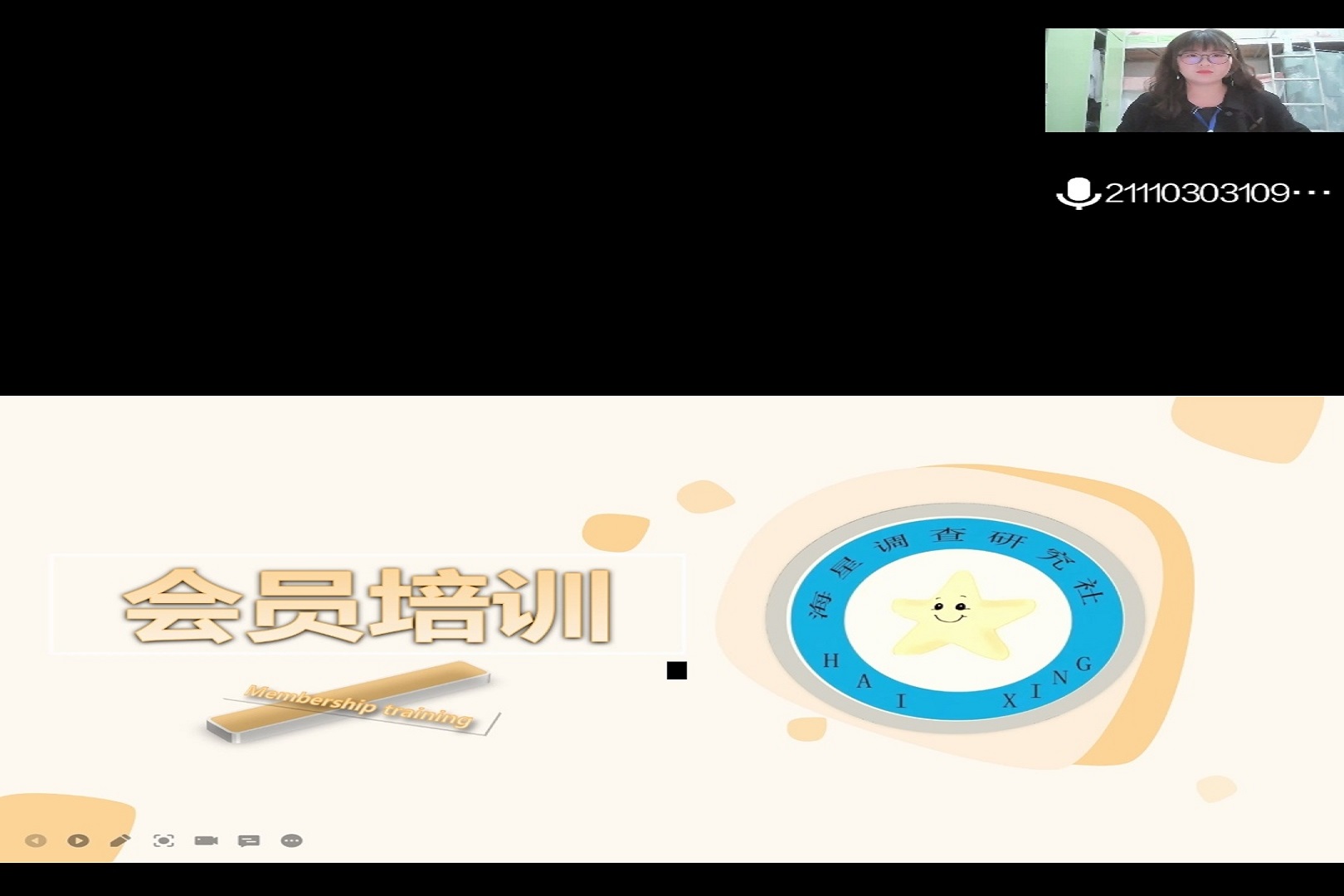 本网讯(海星调查研究社 王静)为使21级新同学能够更加深入了解海星调查研究社的状况,关注社团发展,同时更好地推动社团的自身建设,丰富校园文化。海星调查研究社于11月13日召开线上会员培训会。海星调查研究社会长周尤,副会长夏惜玲、梁詠岚,各部门负责人,理事及全体会员到场参加会议。本次会议由夏惜玲、梁詠岚主持。