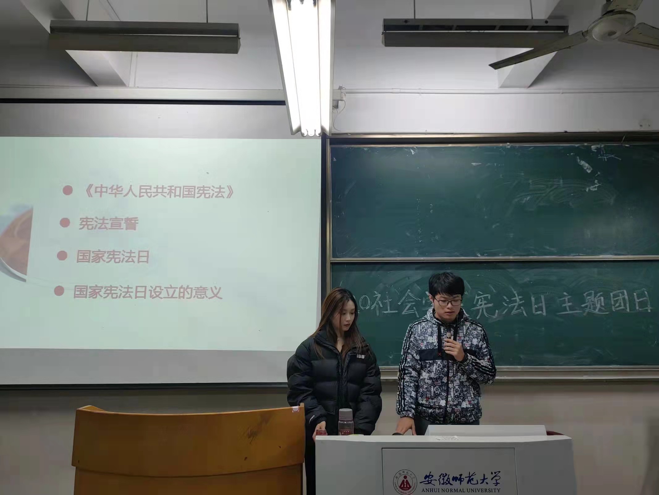 本次团日活动旨在引导我班学子树立宪法意识,恪守宪法原则,弘扬宪法精神,履行宪法使命。首先,陶子详细地介绍了《中华人民共和国宪法》颁布与修订的历史。宪法是我国的根本大法,是治国安邦的总章程,是保持国家统一、民族团结、经济发展、社会进步和长治久安的法律基础,是中国共产党执政兴国、团结带领全国各族人民建设中国特色社会主义的法律保证。只有当同学们真正去学习、了解宪法,才能懂得宪法对实现中华民族伟大复兴的中国梦的重要意义。接着,李思蓉带领大家进行宪法宣誓,重温宪法誓词。“忠于中华人民共和国宪法,维护宪法权威”这不仅仅是同学们口头的誓言,更会在以后的生活中一一实践。宪法宣誓是对责任的宣告,也是对作为中国公民的使命的铭记。之后,陶子向大家讲述了国家宪法日设立的重要意义。国家宪法日的设立不仅有助于普及宪法知识、落实依宪治国,也有助于在国际社会中树立我国尊重宪法的良好形象,扩大我国宪法的国际影响。在活动的最后,陶子进行了宪法征文活动的宣传并鼓励大家积极参与。